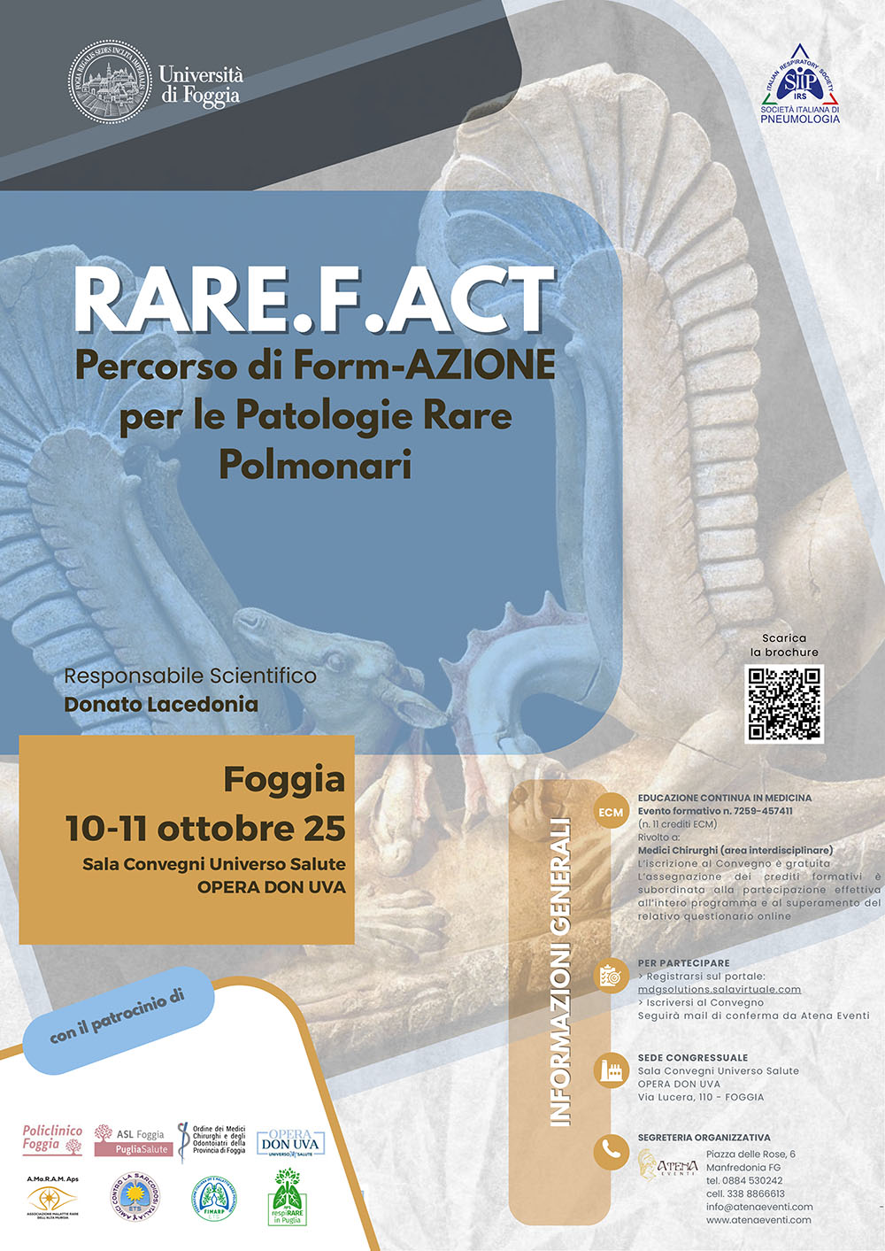 10 - 11 ottobre Rare.F.Act - Percorso di Form-Azione per le Patologie Rare Polmonari Foggia | Sala Convegni Universo Salute Opera Don Uva (Via Lucera, 110) Organizzato dall'Associazione Malattie Rare dell’Alta Murgia (A.Ma.R.A.M. Aps) Per leggere il programma cliccare qui Per partecipare all'evento iscriversi cliccando qui Evento ECM