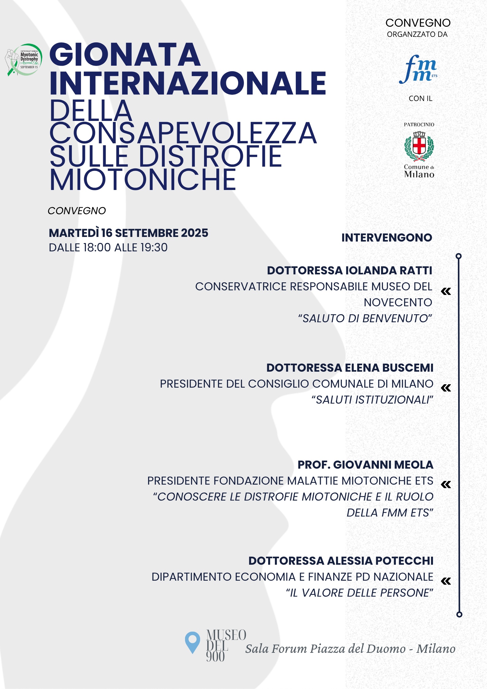 16 settembre - 18.00/19.30 Giornata internazionale della consapevolezza sulle distrofie miotoniche Milano | Museo del 900 (Piazza del Duomo, 8) Promosso dalla Fondazione Malattie Miotoniche ETS