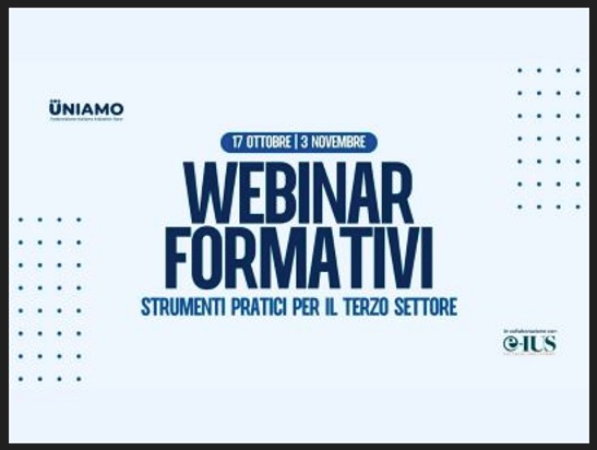 17 ottobre - 15.00/17.00 Webinar Il volontariato nel Terzo Settore: introduzione e quadro normativo generale, adempimenti obbligatori per gli ETS, casi pratici e buone prassi Promosso da UNIAMO Federazione Italiana Malattie Rare ONLUS Per iscriversi all'incontro cliccare qui
